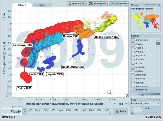 Some of you may have seen Hans Rosling’s TED talks which leverage this tool. (For example, his 2007 talk on new insights on poverty or his 2010 talk on the good news of the decade about child mortality.) Some reviewers have said that in his talks, “data comes to live and sings” to the audience.