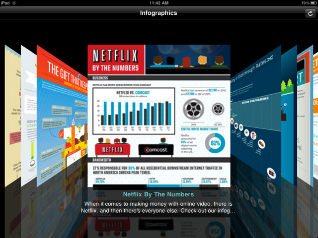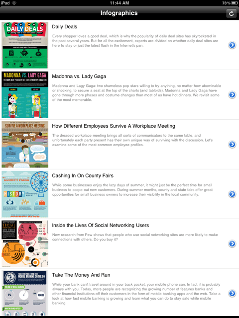 Recently I downloaded an iPad app called Infographics created by the company Column Five. I found it interesting not so much because of the app itself (which has limited functionality and the recent update crashes quite frequently), but because of the rather large amount of infographics it allows you to browse quickly (unfortunately not by category or keyword and there is no search).