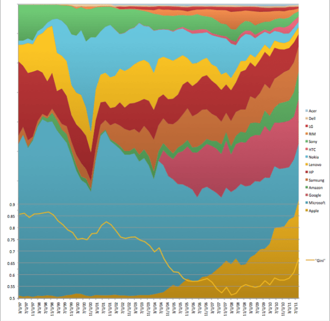- Mobile devices era 2007-2011 – Gini increases again to 0.65 due to increasing dominance of AAPL and irrelevance of smaller players