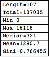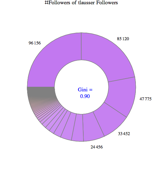 As a user of Twitter for about 3 years now I decided to do some simple analysis, wondering about the degrees of inequality I would find there. Imagine you want to spread the word about some new event and send out a tweet. How many people you reach depends on how many followers you have, how many of those retweet your message, how many followers they have, how many other messages they send out and so on. Let’s look at my first twitter account (“tlausser”); here are some basic numbers of my followers and their respective followers: