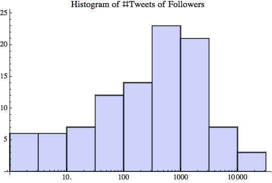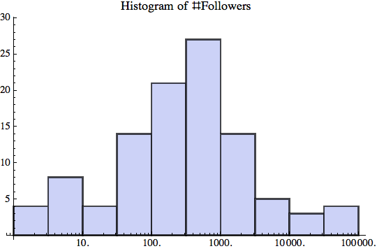 Most of my followers have between 100-1000 followers themselves, as can be seen from this log-scale Histogram.