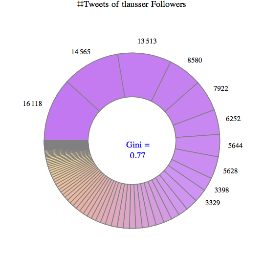 Some of them have not tweeted anything, the chattiest has sent more than 16,000 tweets. On average, each follower has 1280 tweets; the total of 137,000 tweets is again highly unequally distributed for a Gini index of 0.77.
