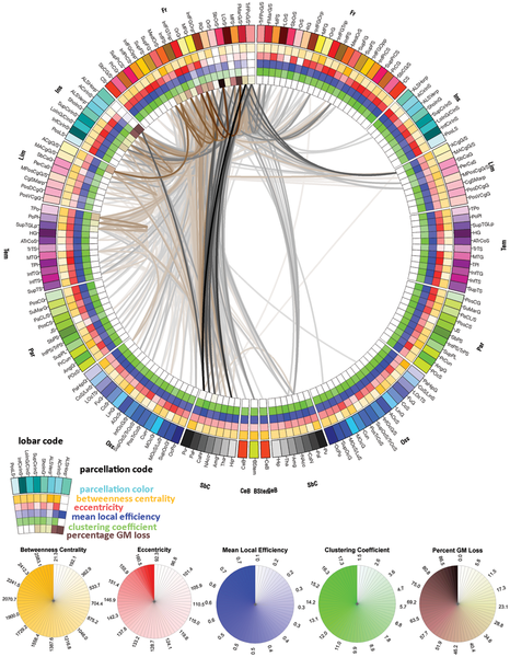 The lines in this connectogram graphic represent the connections between brain regions that were lost or damaged by the passage of the tamping iron. Fiber pathway damage extended beyond the left frontal cortex to regions of the left temporal, partial, and occipital cortices as well as to basal ganglia, brain stem, and cerebellum. Inter-hemispheric connections of the frontal and limbic lobes as well as basal ganglia were also affected. Connections in grayscale indicate those pathways that were completely lost in the presence of the tamping iron, while those in shades of tan indicate those partially severed. Pathway transparency indicates the relative density of the affected pathway. In contrast to the morphometric measurements depicted in Fig. 2, the inner four rings of the connectogram here indicate (from the outside inward) the regional network metrics of betweenness centrality, regional eccentricity, local efficiency, clustering coefficient, and the percent of GM loss, respectively, in the presence of the tamping iron, in each instance averaged over the N = 110 subjects.