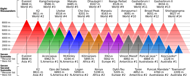 On the Wikipedia page I found an interesting graphic comparing the 14 Eight-thousanders with the Seven + Seven Second Summits. It was created by Cmglee and shared on the Wikipedia page.