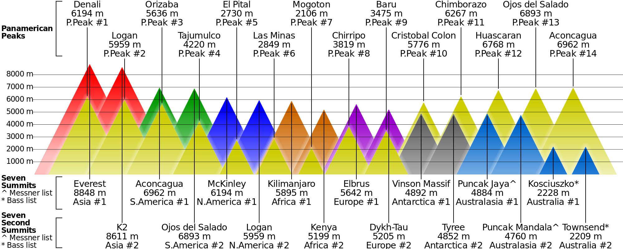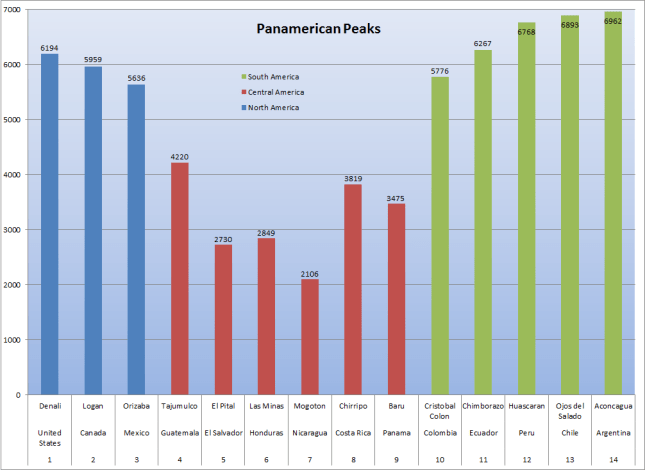 Four of those peaks are included in the Seven (Second) Summit lists above: Denali, Logan (North America) and Aconcagua, Ojos (South America). It would be great to include the other 10 Panamerican Peaks in a similar graphic. About time for me to look into generating .svg graphics…