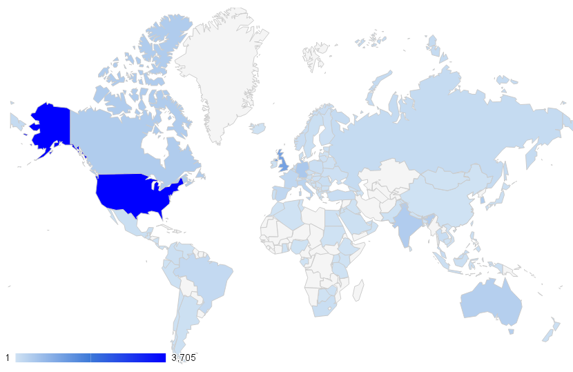 A large fraction (> 65%) of referrals comes from search engines. Within those, it’s mostly Google (>90% summed across many countries) with just a small amount of others like Bing. It’s safe to say that without Google search my Blog would have practically no views. Chances are that your first exposure to this Blog came from a Google search as well. One unexpected insight for me was to see a high ratio of image to text searches, typically 3:1 or 4:1. In some ways it shouldn’t be surprising that a blog on data visualizations gets discovered more often by searching for visual elements than for text. It also jibes with the enormous growth of image related sites such as Instagram or Pinterest. I just would not have expected the ratio to be that high.