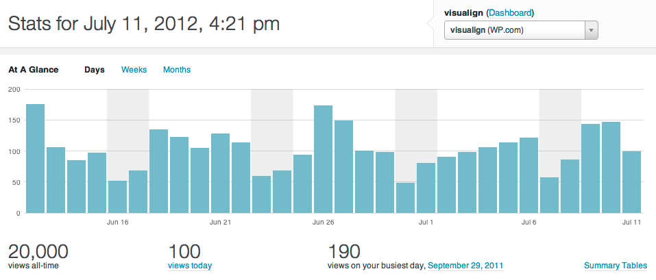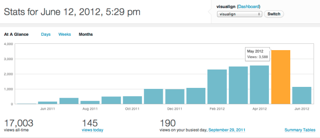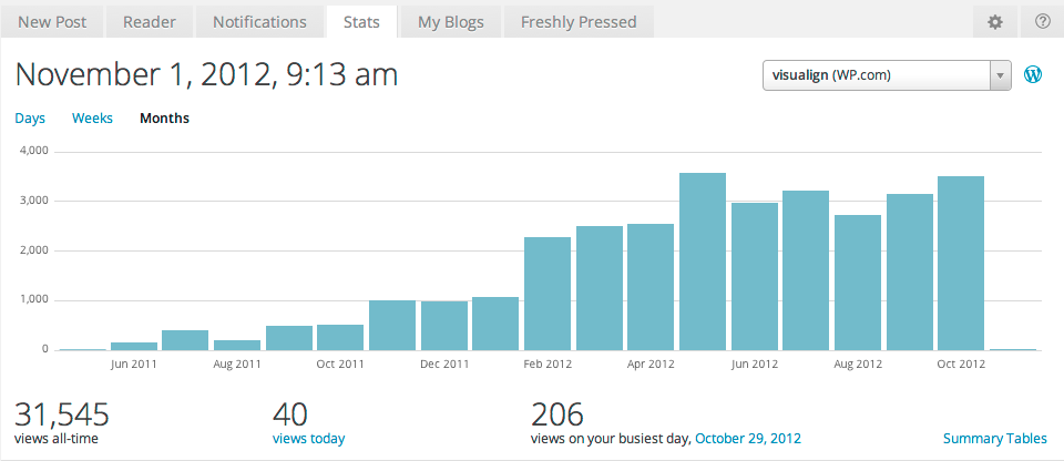 I started this Data Visualization Blog back at the end of May 2011. WordPress provides decent analytics to measure things like views, referrer, clicks, etc. The built-in stats show bar charts by day/week/month, views by country, top posts and pages, search engine terms, comments, followers, tags and so on. I have accumulated the view data and wanted to share some analysis thereof.