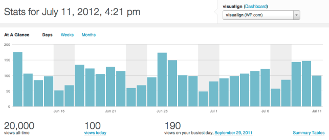 Addendum 7/11/2012: Today my Blog reached 20,000 views. I noticed over the last few weeks that the deviation from an exponential growth model was getting quite large. For an exponential trend line R² = 0.9886.