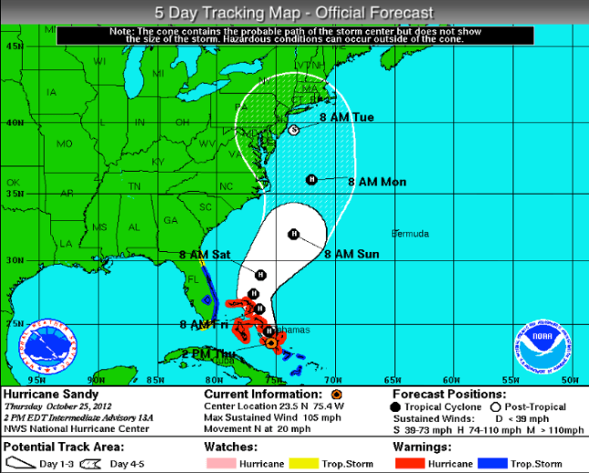 Last week a new tropical storm emerged in the Carribean and was named ‘Sandy’. A few days ago with Sandy’s center over the Bahamas, the path looked like this: