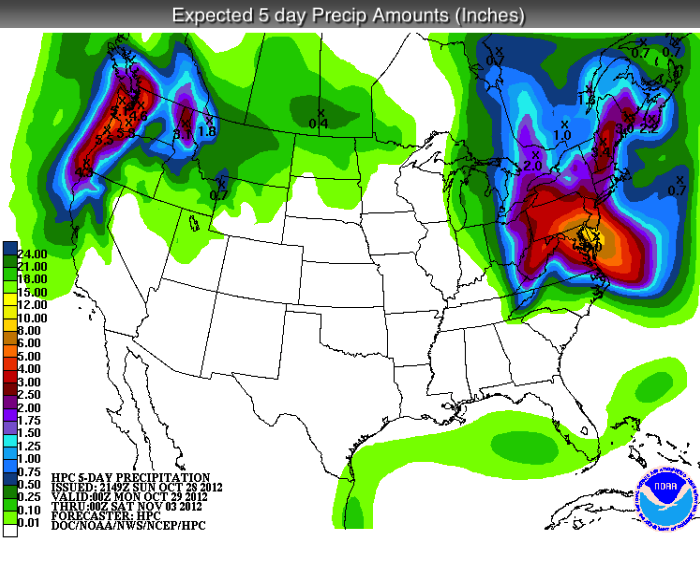Understandably this forecast of superstorm Sandy has the authorities worried. The full moon tomorrow exacerbates the tides and New York City is expecting up to 11 ft storm surge. Cities across the Northeast are taking precautions as of this writing. For example, the New York City subway metro transit system is shutting down tonight and several hundred thousand people in low-lying coastal areas are under mandatory evacuation order. More than 5000 flights to the area on Monday have been cancelled. Take a look at the expected 5 day precipitation forecast in the Northeast. Some areas may get up to 10 inches of rain and/or snow!
