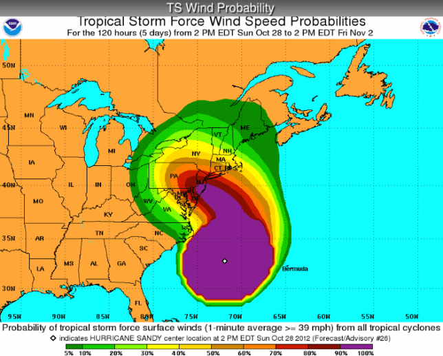 Dr. Ryan Maue, a meteorologist at WeatherBELL, put out this animated GIF of the storm’s approach yesterday. “This is unprecedented –absolutely stunning upper-level configuration pinwheeling #Sandy on-shore like ping-pong ball,” he tweeted. It shows how cold air to the north and west of the storm spin Sandy into the mid-atlantic coastline.