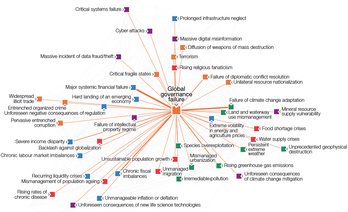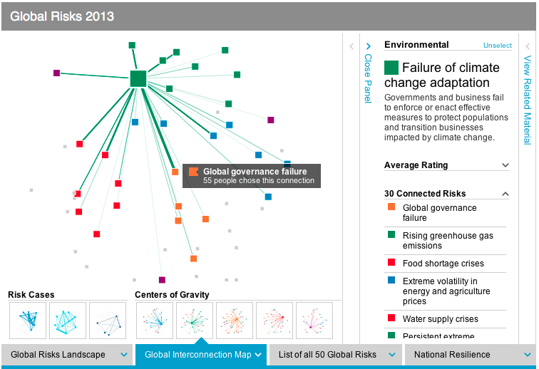 There are many more aspects to this report, including the appendices with survey results, national resilience rankings, three global risk scenarios, five X-factor risks, etc. For our purposes here suffice it to say that the use of advanced data visualizations together with online exploration of the data set is a welcome evolution of such public reports. A decade ago no amount of money could have bought the kind of interactive report and analysis tools which are now available for free. The clarity of the risk landscape picture that’s emerging is exciting, although the landscape itself is rather concerning.