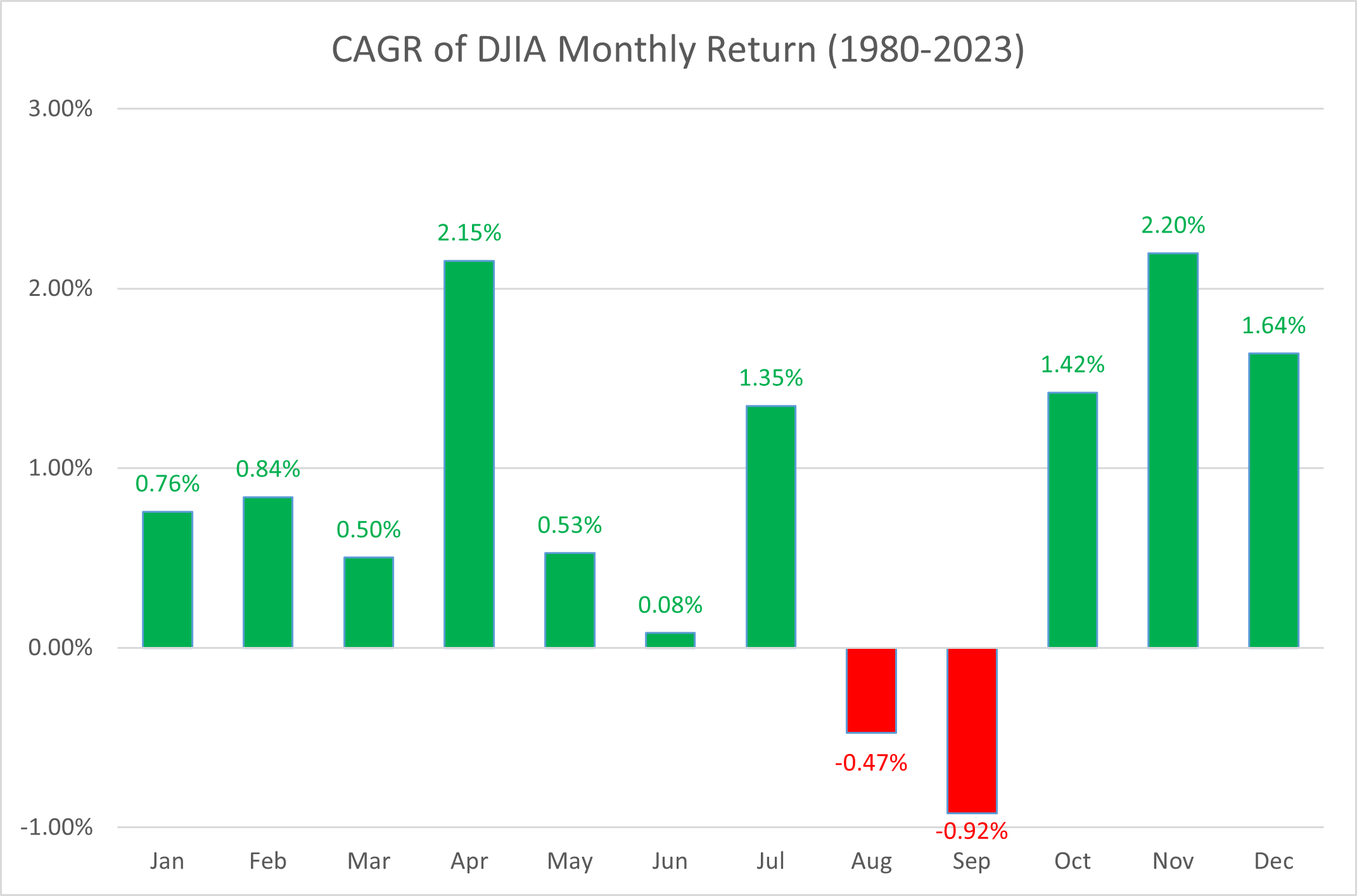 A good granularity into this is provided by looking at the stock market performance by month. One article on stockanalysis.com describes the average monthly stock return based on the S&P 500 from 1980- 2018: