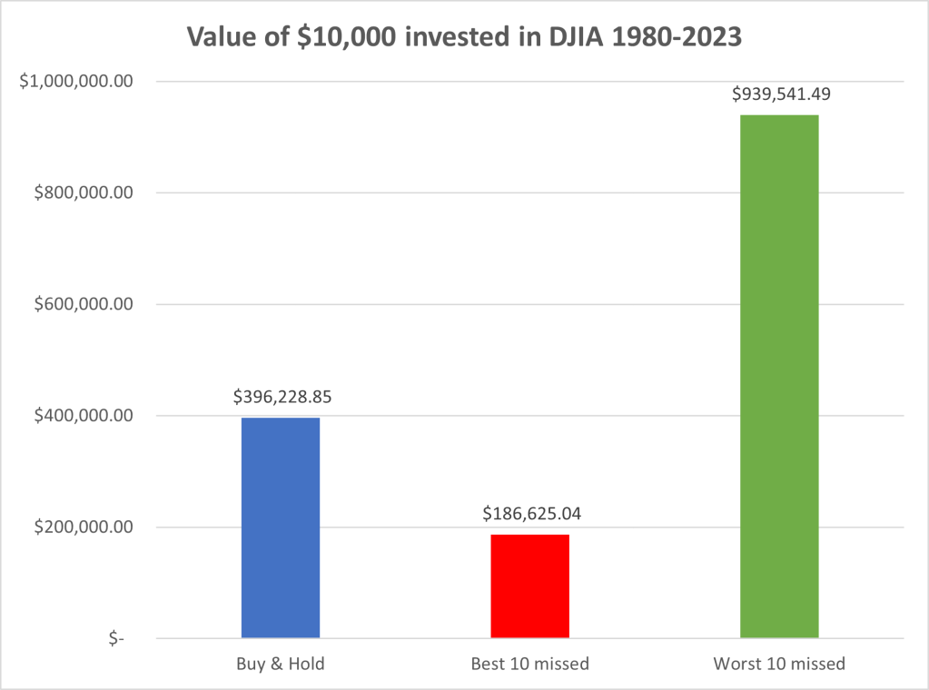 Let’s look at some data. Specifically, I downloaded the publicly available historical data of the Dow Jones Industrial Average (DJIA) with daily open close levels from 1980-2023. Then I did a similar analysis for the hypothetical returns of the DJIA relative to “missing out” on the best 10 vs. the worst 10 days: