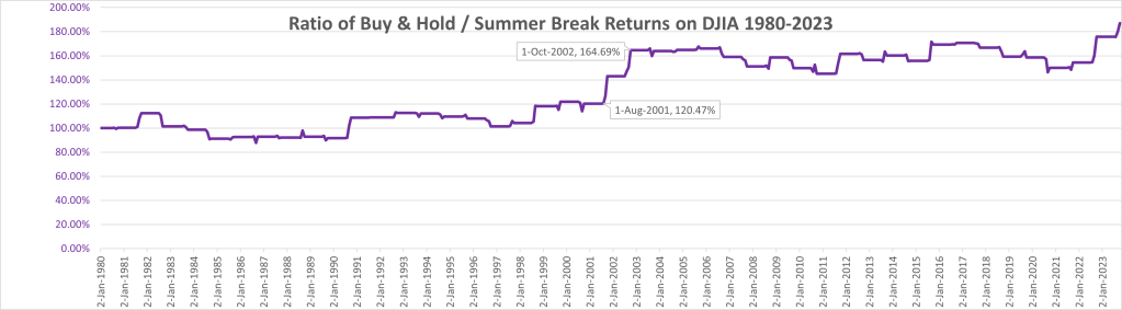 - A select few years contribute the most to the difference, such as 2001 and 2002, when Summer Break leaps from 1.2x to 1.6x of Buy & Hold (see data callouts below).