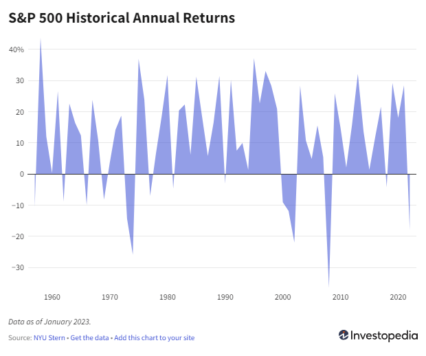 Historical data shows annual returns in the order of 11.8% for the S&P 500 over the last 60 years. However, there are big swings as can be seen in the following chart (Source article on Investopedia):