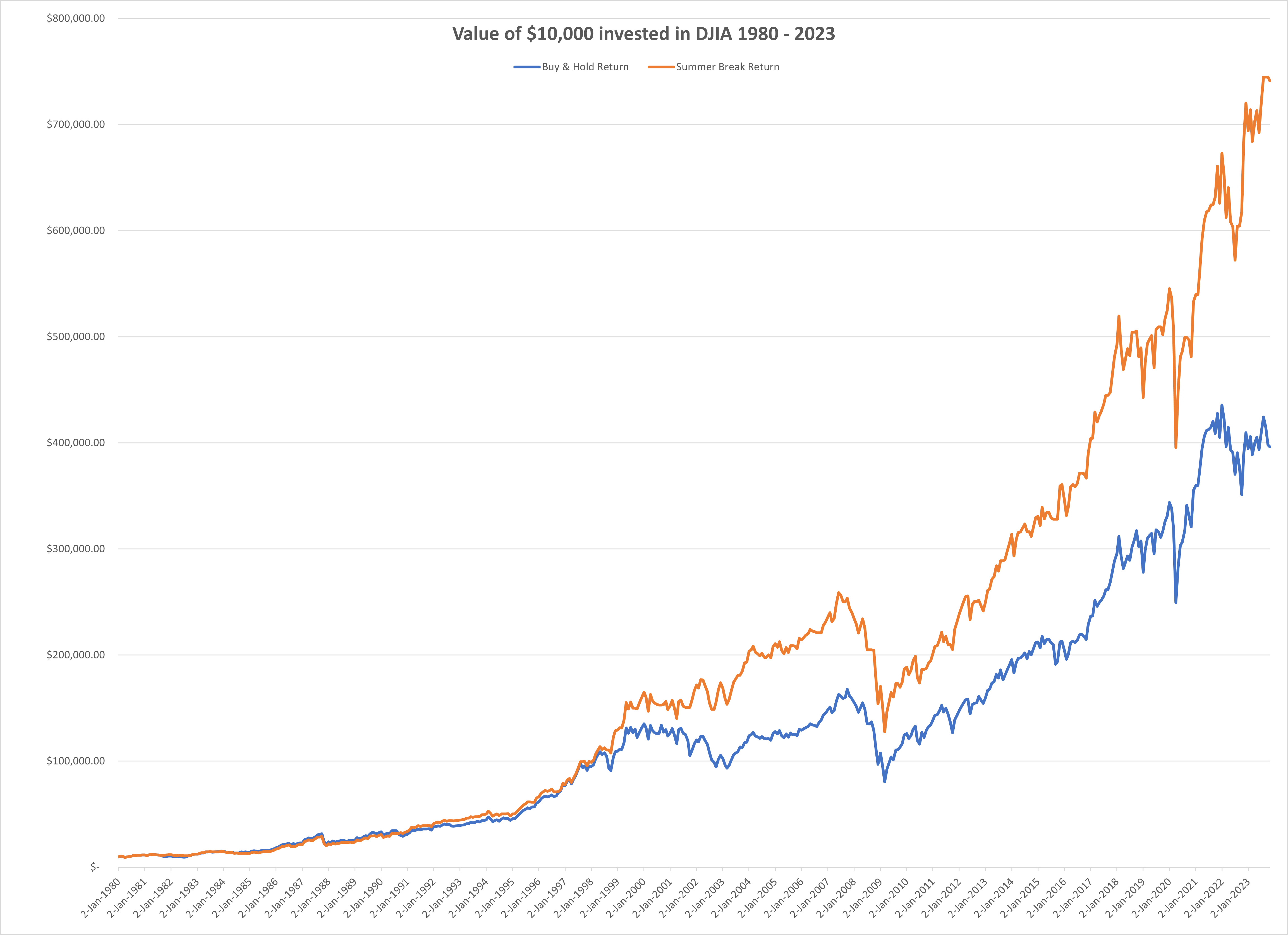 Based on the DJIA data I simulated the Summer Break strategy and plotted the returns of an initial $10,000 investment at the beginning of 1980 until 1-Nov-2023 for Summer Break (orange) and Buy & Hold (blue):