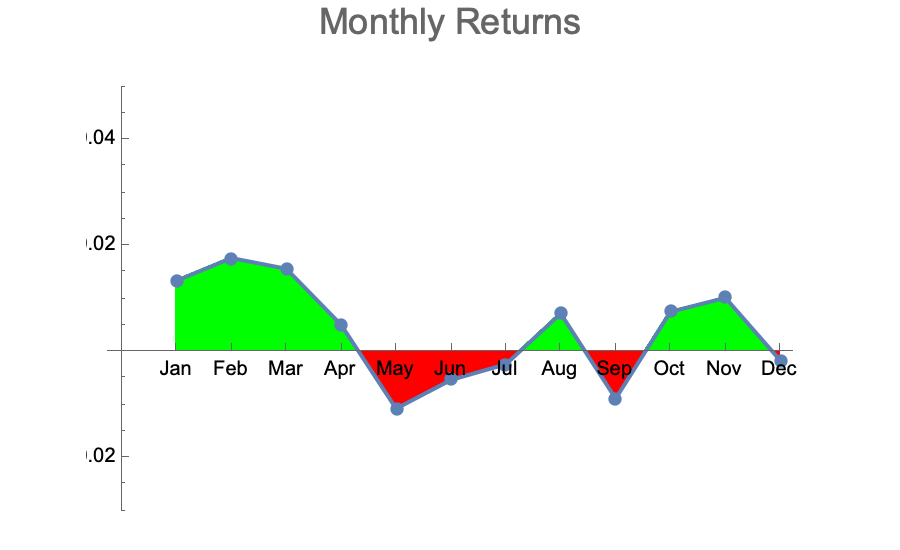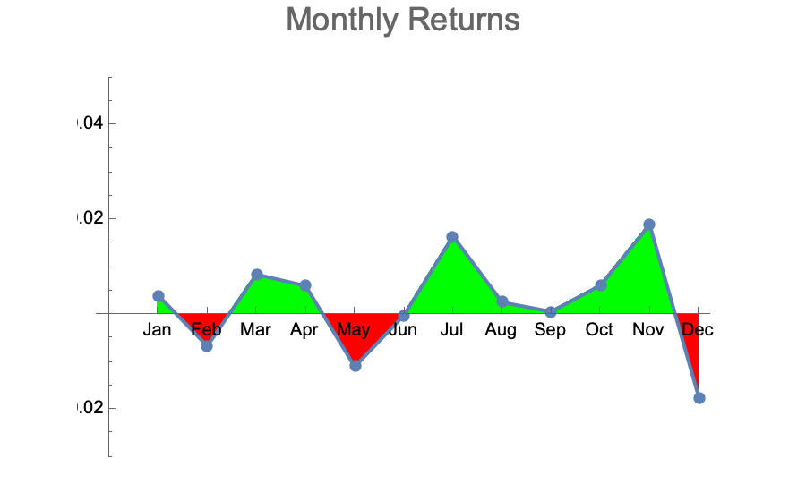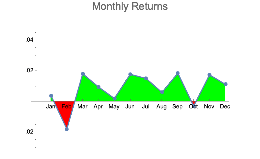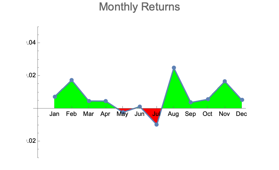 With the default modeling parameters picked by Jason Cawley, I ran dozens of simulations at 10,080 datapoints each. I then aggregated the monthly returns over those 40 simulated years to see what kind of variation would be observed per month. Here are some typical results: