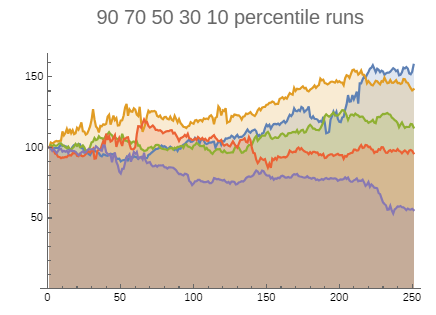 The model used above includes a handful of parameters such as an overall drift or the probability, strength and duration of a volatility period (called spike). Each scenario would have 20 runs over 250 steps (approximate number of trading days in a calendar year) and then visualize the trajectories of initial prices set to 100 for the 10, 30, 50, 70 and 90 percentile (when sorted by final valuation of the simulated stock). A typical image of such a scenario looks like this: