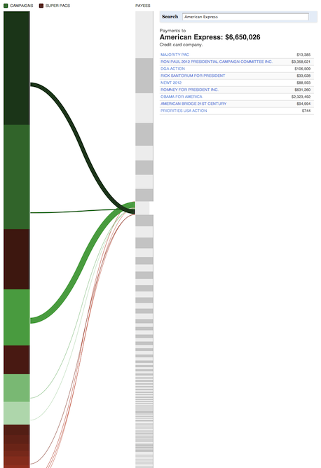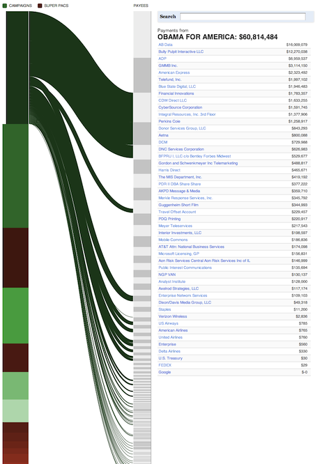 Note the campaigns in green and the Super-PACs in brown color. The data is sourced from FEC and the New York Times Campaign Finance API. Note that in the interactive version you can click on any source on the left or any destination on the right to see the outgoing and incoming streams.