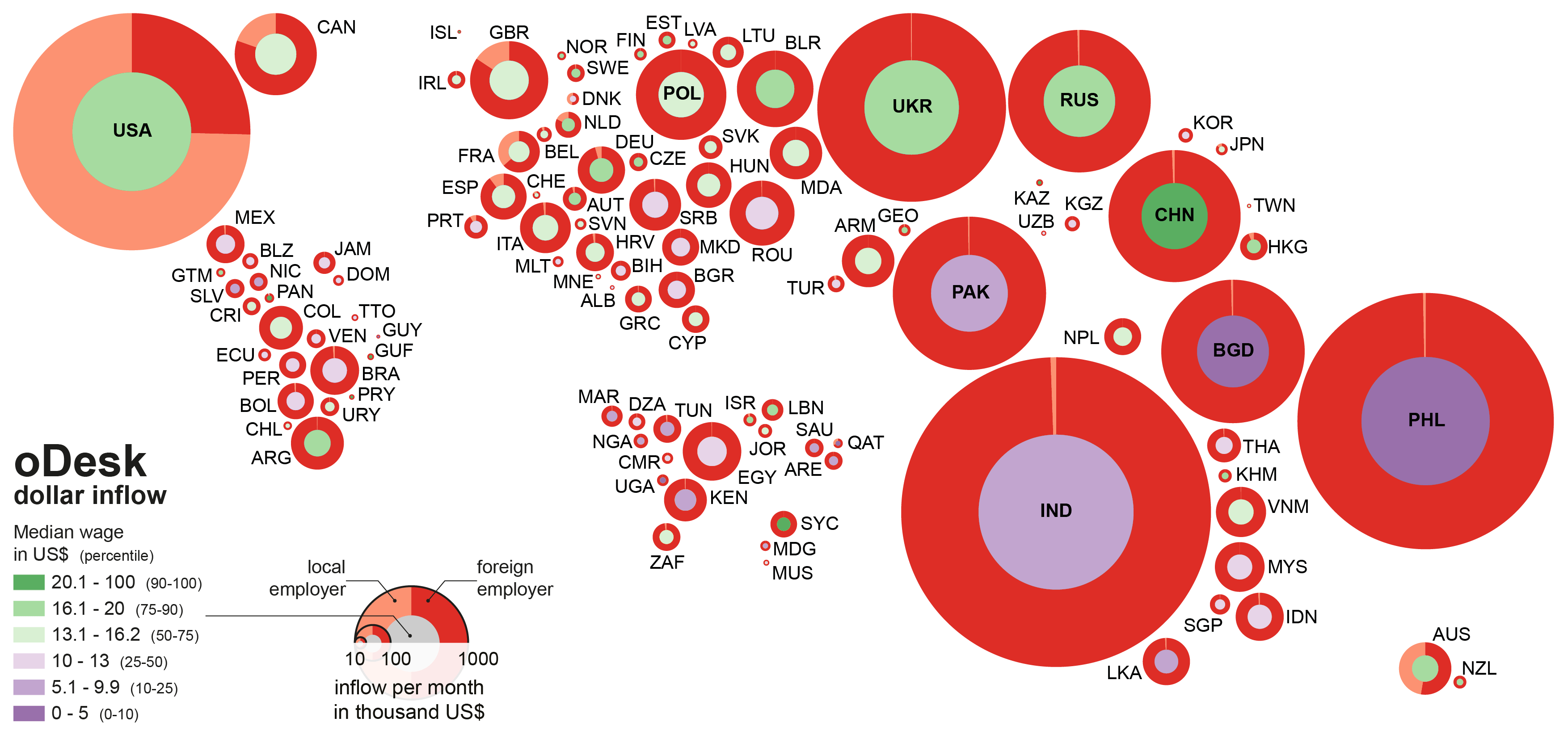 The cartogram depicts each country as a circle and sizes each country according to dollar inflow to each country during March 2013 (on the freelance work oDesk.com platform, rebranded in 2015 to Upwork). The shading of the inner circle indicates the median hourly rate published by digital workers in that country. The graphic broadly reveals that median wages are, perhaps unsurprisingly low in developing countries and are significantly higher in wealthier countries.