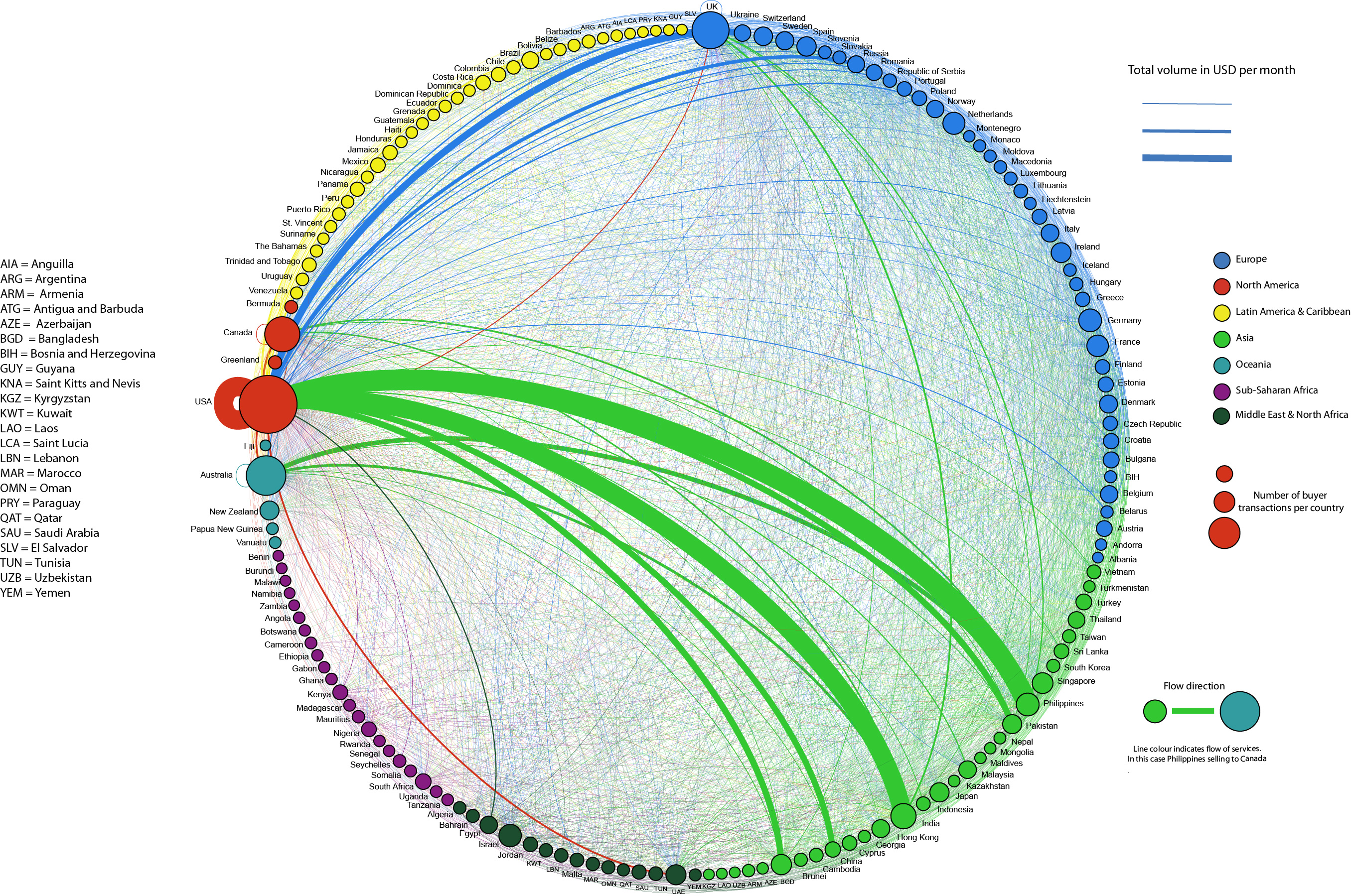 Another very interesting and dense visualization is a connectogram (see our previous post on Connectograms and the Circos tool) demonstrating the highly international trade in the online Gig-Economy: 89% of the trade measured by value happened between a client and a contractor who are in different countries. The network therefore attempts to illustrate the entirety of those international flows in one graph. It depicts countries as nodes (i.e. circles) and volumes of transactions between buyers and sellers in those countries as edges (i.e. the lines connecting countries). Country nodes are shaded according to the world region that they are in and sized according to the number of buyer transactions originating in them. Edges are coloured according to the flow of services: with the line shaded as the colour of the originating/selling region. Edges are also weighted according to the total volume of trade.