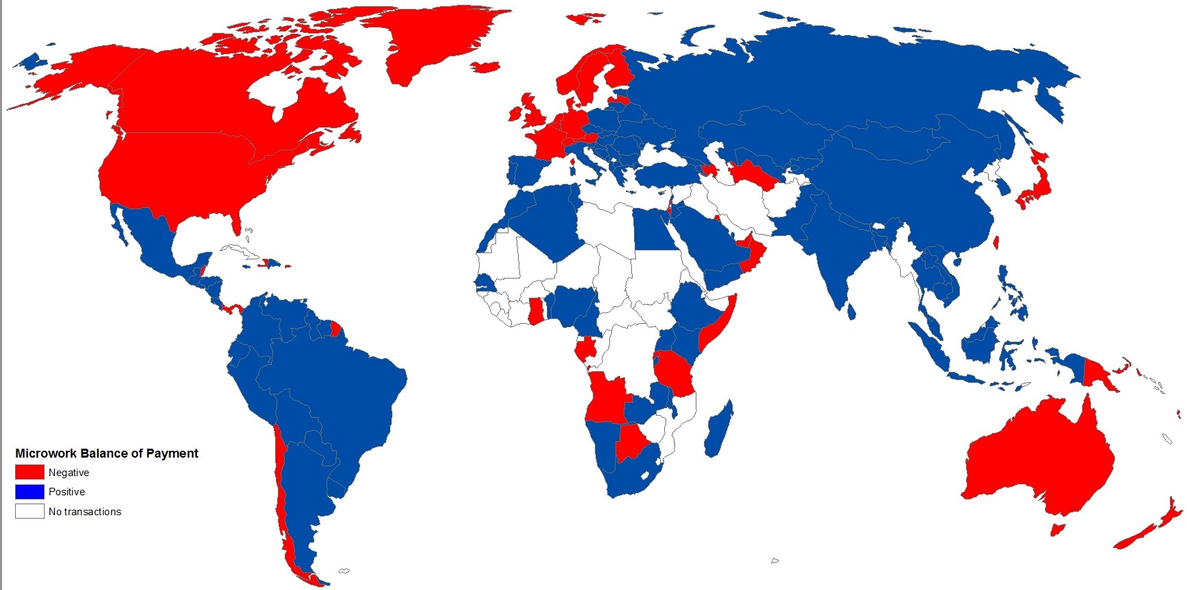 Another Blog post on the geographies of online work adds several more visualizations (based on 2013 data, so a bit dated by now). For instance, one world map highlights the relationship between supply and demand. It distinguishes between countries with a positive balance of payment (i.e. countries in which more work is sold than bought) and countries with a negative balance of payment (countries in which more work is bought than is sold). The figure more clearly delineates the geography of supply and demand: with much of the world’s demand coming from only a few places in the Global North.
