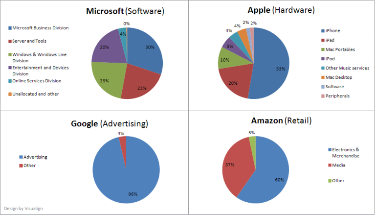 We have also looked at four large tech companies, starting with this post back in 2012 on Side by Side: Apple, Microsoft, Google, Amazon. We had created a composite back then for these four companies to show just the sources of revenue (akin to the left side of the Sankey diagrams for the inflow to the central revenue bar):