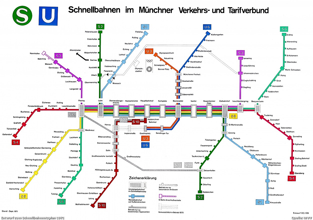 This style of map has been widely adopted and successively refined. Having grown up in Munich and having used its train (S-Bahn) and subway (U-Bahn) system for some 25 years, I came to realize that it is not only a convenient tool for the traveller. It can form the basis of mental models of the topology of a city. The first lines of the Munich S- and U-Bahn system were built for the Olympic Games in 1972. The history and evolution of the train and subway system over the 40 years since has been documented on this website. Let’s look at the tube maps and their evolution in roughly 10 year time intervals.