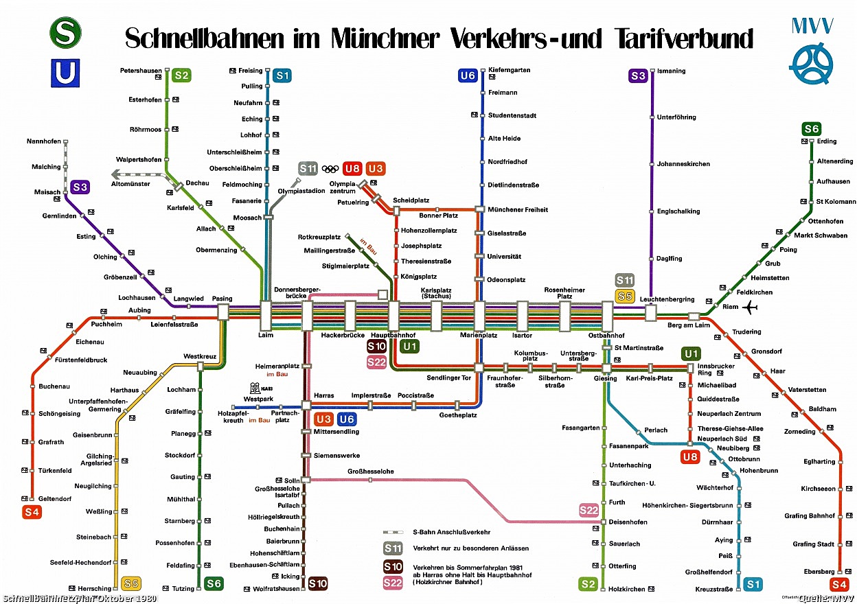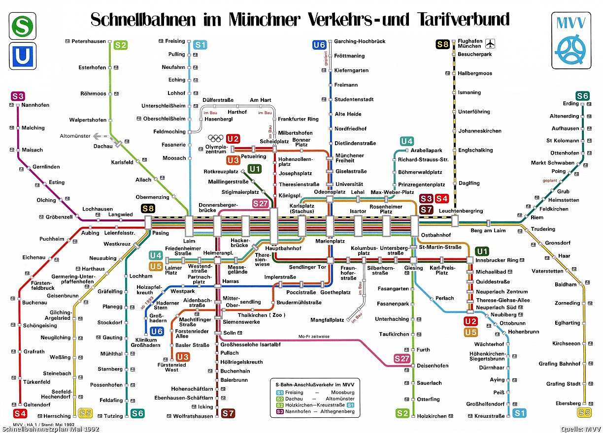 1992: Some additional U-Bahn lines and stations fill in the center. One of the S-Bahn lines is renamed (S3 -> S8) and extended to the North to connect to the new Munich airport (Erding). Also a few minor map changes (new color scheme, font and legend).
