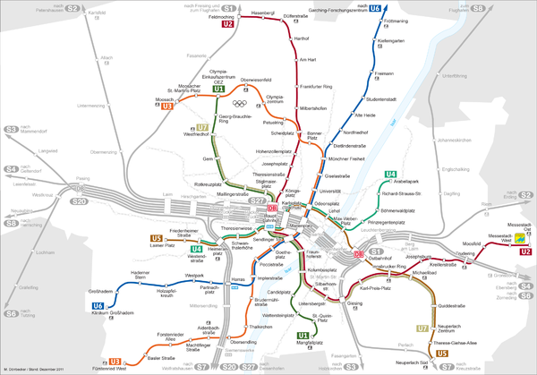 2012: The current map adds several graphical aspects such as the concentric rings of background color for tariff boundaries, a new font for cleaner look and less line breaks as well as icons for long distance train connections. It also shows some geographic features such as the Isar river and the two lakes in the South-West as well as icons for tourist attractions or land-marks such as the new soccer stadium, the ‘Deutsches Museum’ or the Zoo. For a hi-res map see this pdf file.