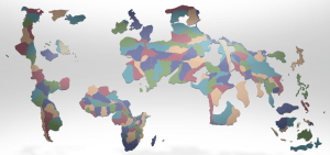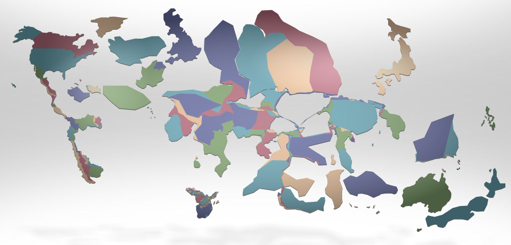 Cartograms visualize a particular metric by adjusting a country’s size corresponding to that metric. It leaves country neighborhood relationships (which we blogged about here) intact, but inflates or deflates countries, often dramatically so. Here is a series of three cartograms showing the adoption of mobile phones in the years 1995, 2000, and 2008. Size of each country is proportional to the density of mobile phones (average # mobile phones per 100 people).