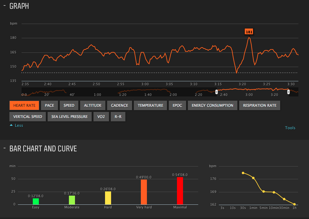 There are many individual measurements available for display, some based on individual sensors (like heart rate or GPS location or temperature or altitude / air pressure), others based on calculations and estimates (such as speed, recovery parameter “R&R”, EPOC or VO2).