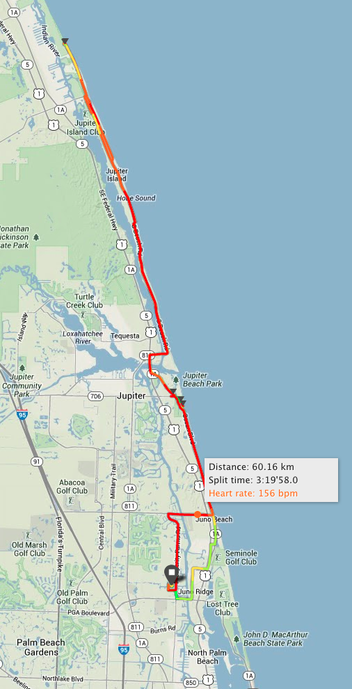 The Suunto Ambit can do a lot more, including customizing the display mode and storing your configurations in so-called apps. One idea I have for this is to display an estimate of the total calorie consumption for a known route when continuing at the current pace (but I haven’t played with the programming yet). The Ambit seems to be particularly well suited to hiking, mountain biking or skiing due to its altimeter; however I don’t get to leverage that in flat Florida. Only the few bridges over the Intracoastal waterway show up as bumps in the vertical – with the corresponding acceleration of the heart rate on the uphill side.