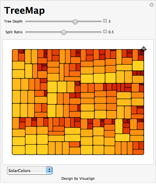 One of the fundamental tenets of this Blog is that interactive visualizations lead to better understanding of structure in the data or of the dynamic properties of a model. You can interact with this algorithm in the TreeMap model in Computable Document Format (CDF). Simply click on the graphic above and you get redirected to a site where you can interact with the model (requires one-time loading of the free CDF Browser Plug-In). You can change the shape of the outer rectangle, adjust the tree level and split-ratio and pick different color-schemes. The values are shown as Tooltips when you hover over the corresponding rectangle. You also have access to the Mathematica source code if you want to modify it further. Here is a TreeMap with three levels: